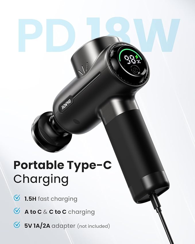 - Massage Gun with Heat: Experience whole-body muscle relaxation with the heating massage head of this RENPHO massage gun. You can also target specific muscle groups with the 4 standard massage heads for an immersive and customizable relaxation experience