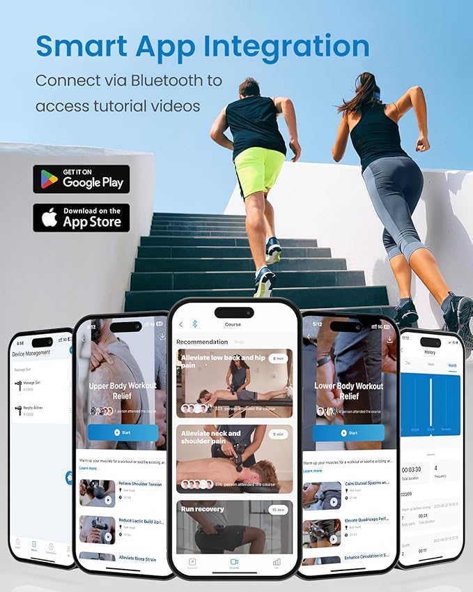 - Smart Personal Muscle Therapy: Connect the deep tissue massage gun to Renpho Health app via Bluetooth to access professional video courses tailored for specific muscle groups, synchronize your massage, control speed levels, and track your massage history
