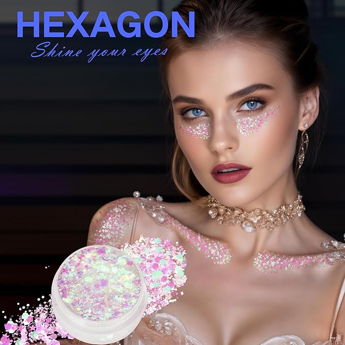 - Shape : hexagon, fine shimmer, chameleon iridescent white, and mermaid tail & star-shaped glitter
