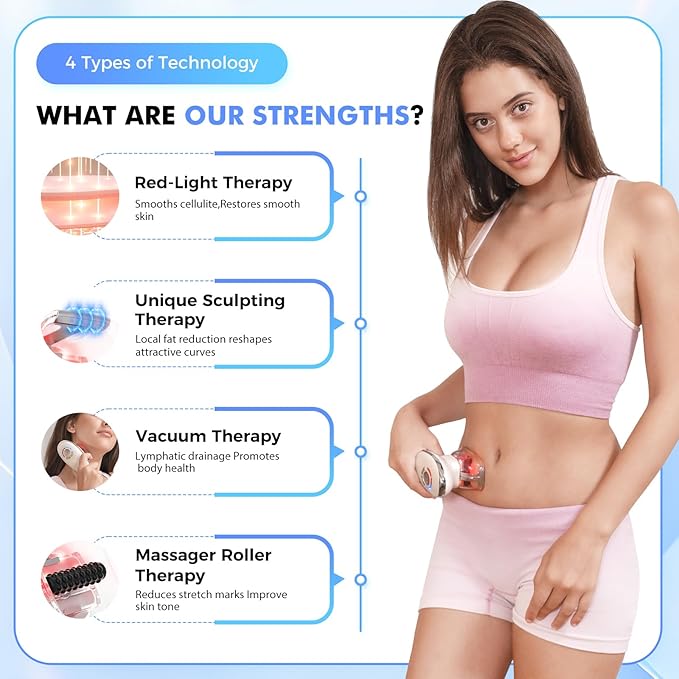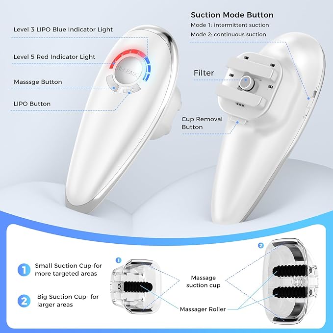 - Tackle every part of your body with ease: 3-in-1 technology works on thighs, stomach, arms, legs, and booty, offering targeted sculpting, toning, and lymphatic drainage. It's a customizable solution tailored to your needs, with interchangeable cups for different areas and adjustable settings.