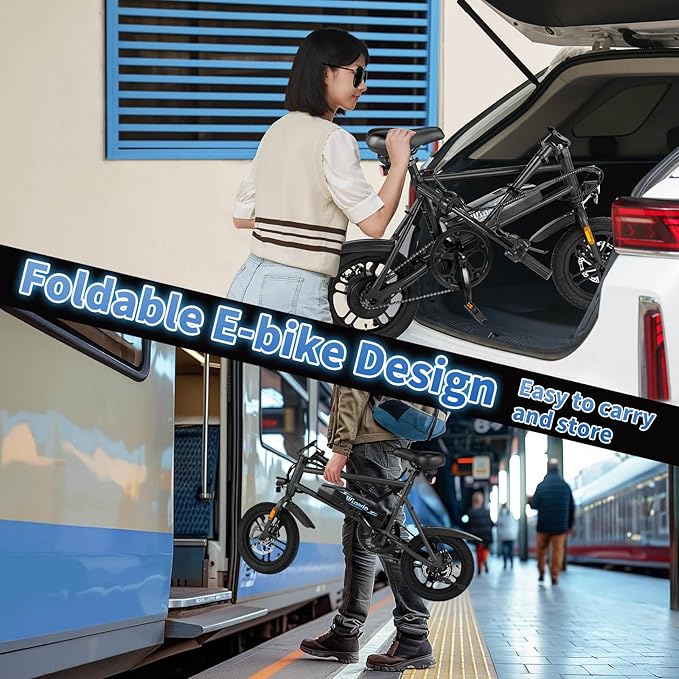 - 【Foldable & Light-wight】- The foldable design of this electric bike ensures it can be easily stored in the garage or any compact space. The lightweight body enhances portability and you can easily carry it in your car or on public transportation. Folded size: 46"L x 27"H, bicycle weight: 48.5 LBS.
