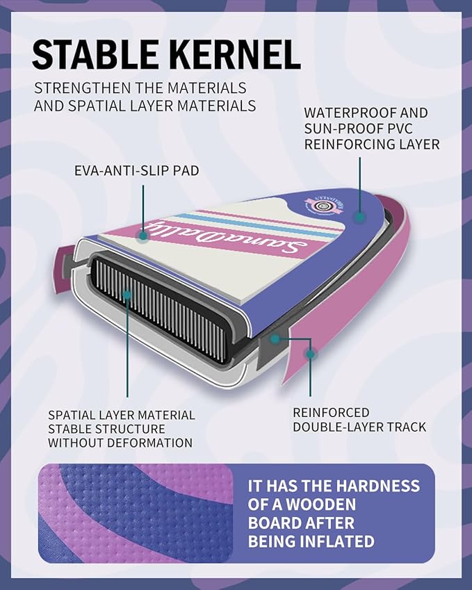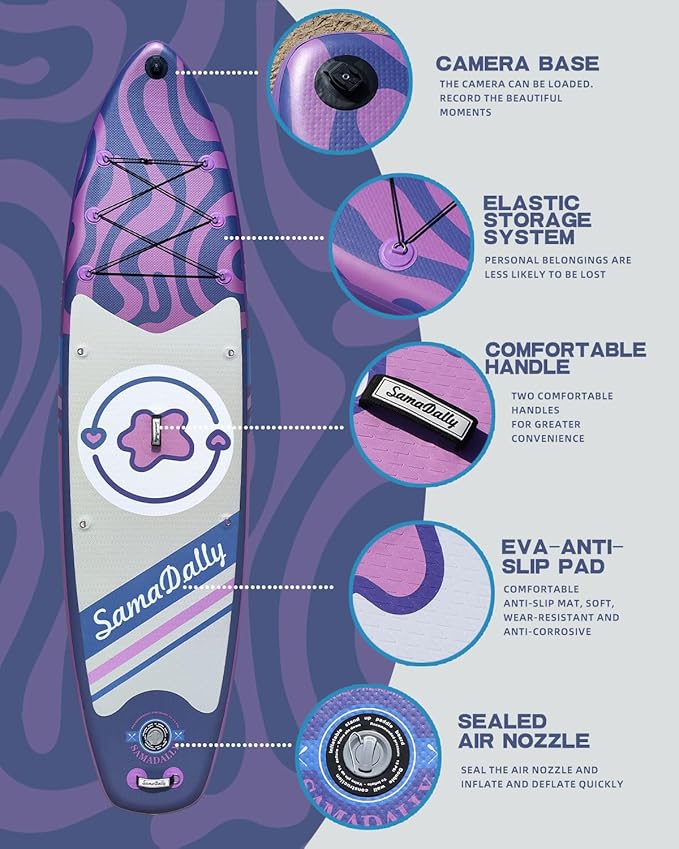 - Spacious & Enjoyable: SamaDally Candy Star series inflatable stand-up paddle boards are 1 to 2 inches wider than other similar products. The 34 - foot paddle surface is extremely spacious. Both beginners and paddleboards enthusiasts can find their own water - based fun on this SUP and enjoy a relaxing time.