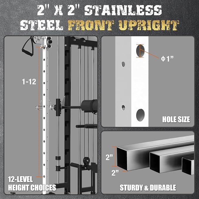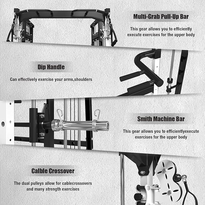 • 【Build Your Dream Home Gym】One machine can meet your various needs.It is combined with power cage,smith machine,cable crossover machine,cable station,and pull-up station,providing a complete strength training setup for home use.Perform a wide range of exercises,including squats,cable workouts,pull-ups and more.It is the ideal equipment for full-body strength training,whether it is a fitness beginner or a professional athlete,can meet diversified fitness needs.
