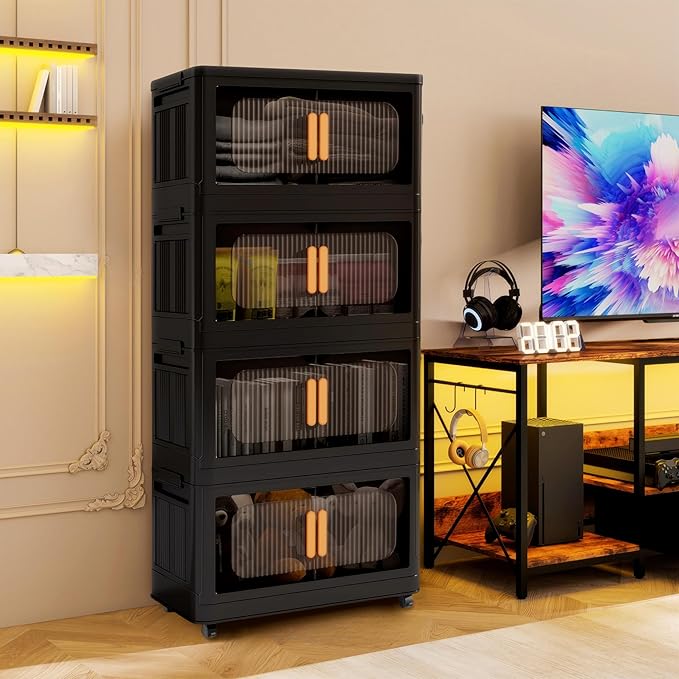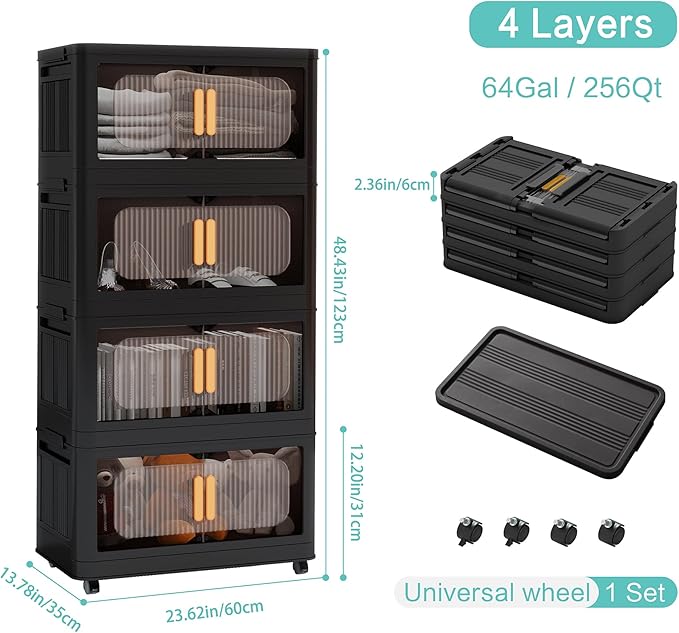 Holaki 256 QT Storage Bins with Lid, 4 Tiers Collapsible Closet Organizers, Stackable Plastic Storage Bins Cabinet with Wheels and Magnetic Door(Black Larger)