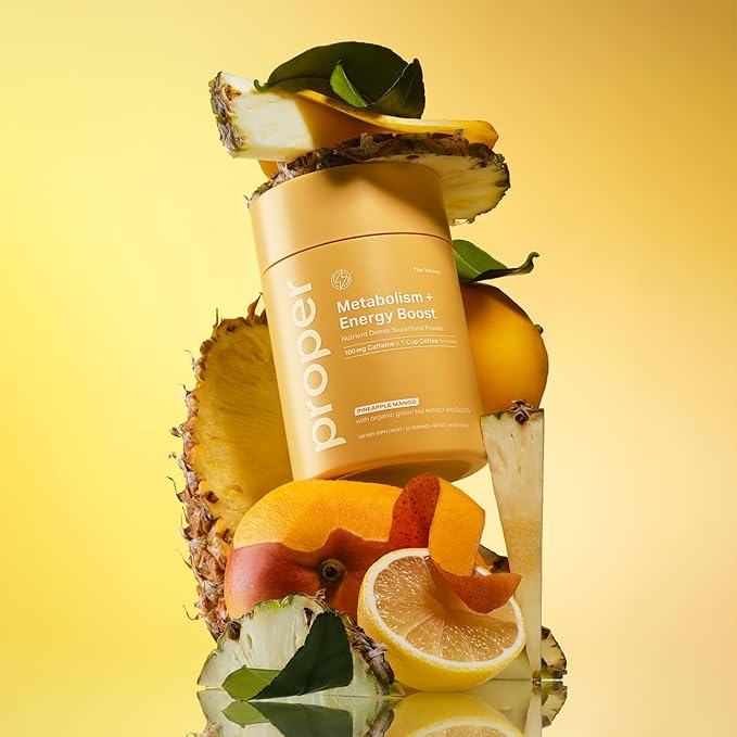 Proper, The Yellows Metabolism and Energy Boost, Sugar Free Energy Drink Powder with 100mg Caffeine. No Creatine or Beta-Alanine. 15 Servings, Pineapple Mango Drink Mix for Men and Women