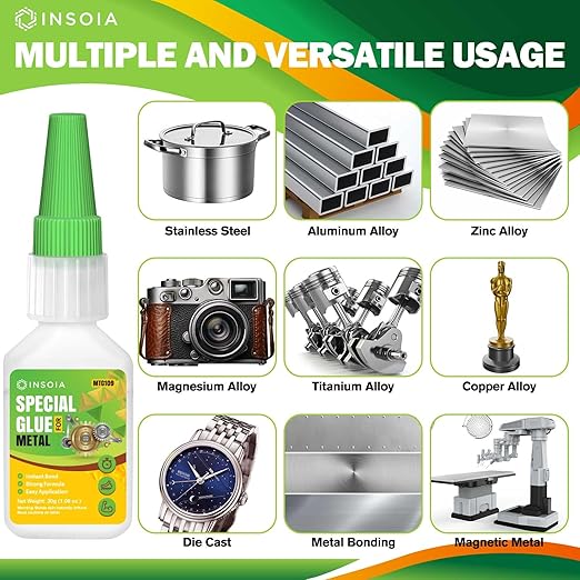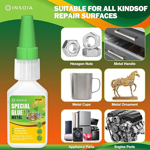 - ?™️?�Super Metal Glue?‘INSOIA Metal Glue is specially engineered for industrial-grade bonding strength, forming long-lasting adhesion between metal and a wide range of other materials. Whether you're fixing stainless steel kitchenware, sealing aluminum tubing, repairing tools, or bonding metal hardware, this super strong metal adhesive delivers a seamless and nearly invisible finish. It?™s ideal for automotive work, jewelry repair, outdoor fixtures, and metal crafts.