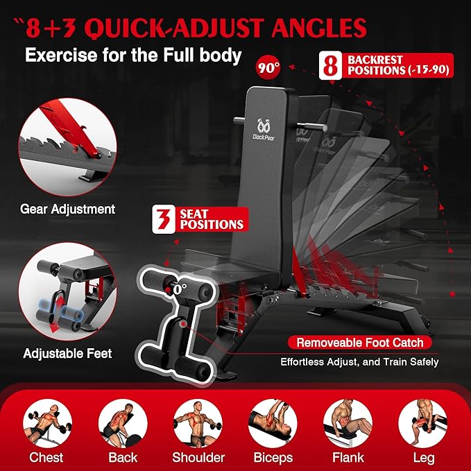 - Compact & Versatile Design: Featuring 8 backrest and 3 seat positions, this bench adapts to your workout needs, offering incline, flat, and decline options up to 90 degrees. The C-shaped lock catch allows for quick and effortless adjustments, making it perfect for strength training, muscle toning, or maintaining your fitness.