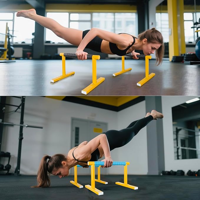 - Perfect Size with 2 Color Grip Tapes: The Diameter 1.3 inch parallettes bars, suitable for both men and women hand hold, with 10 inch height gives enough room to do dips or handstands. and include two color grips tapes for comfortable and non-slip holding or replacement use, great for beginners or the advanced.
