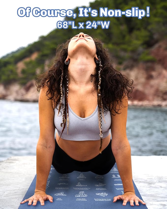 - Enhance your yoga practice with this instructional yoga mat featuring 75 illustrated poses and 75 stretching exercises, perfect for beginners. The 1/4” thick, non-toxic, and non-slip surface ensures safety and comfort during workouts at home or outdoors. Ideal as an exercise mat for home workout or fitness routines
