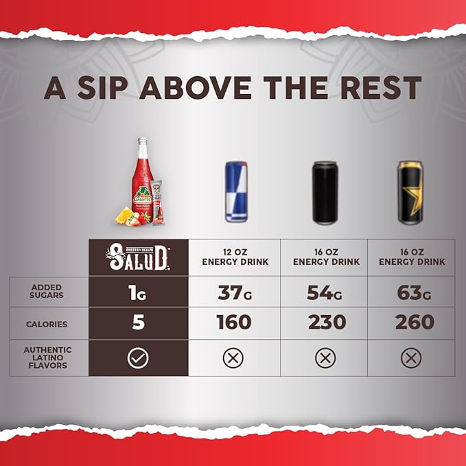 - US vs THEM - Unlike traditional energy drinks loaded with sugars, Salud will turn plain water into a mouth-watering Agua Fresca drink with only 1g of added sugar and 5 calories per serving. You can feel good about starting your mornings and workouts with Salud!