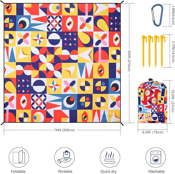 - 🌴【Beach Accessories】1 * beach blanket waterproof sandproof; 4 * Durable ABS Anchor Stakes; 1 * Carabiner; 1 * Carry Bag.