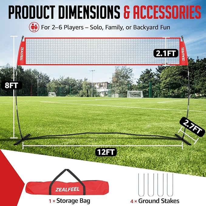 - COMPACT & VERSATILE: With only 12ft width, this outdoor volleyball net fits easily in driveways, backyards, or indoor gyms. It’s ideal for skill practice, casual games, and tight spaces. Beyond volleyball drills, it’s also perfect for backyard frisbee, casual badminton, and family toss games. The volleyball net system includes a 12ft volleyball net, 1 backpack, and 4 ground stakes