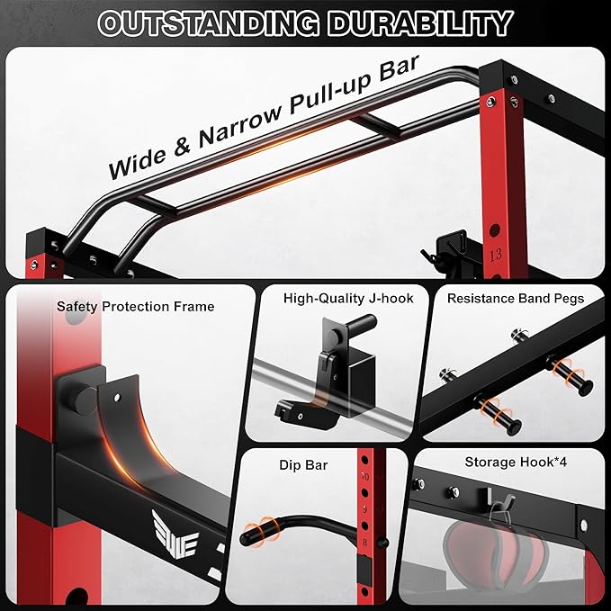 • 【Complete Accessories】Equipped with over twenty professional accessories, this power cage provides you with a diverse home fitness experience. This includes:lat pull-down bar*1, T-bar*1, cable bar*1, cable handle*2, tricep rope*1, J-hooks*2, safety frame*2, dip bar*2, 360° landmine*1, foot board*1 and so on. All accessories can be quickly disassembled and installed. You can switch between sports modes more conveniently and quickly, enhancing your sports experience and efficiency