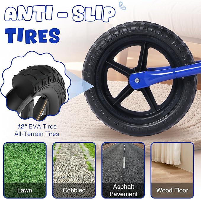 - Multi-Terrain Use Tires: Equipped with durable 12 inch EVA tires, this balance bike can easily navigate various surfaces, such as asphalt pavement, lawn, cobbled, and wood floor, making it perfect for adventures.