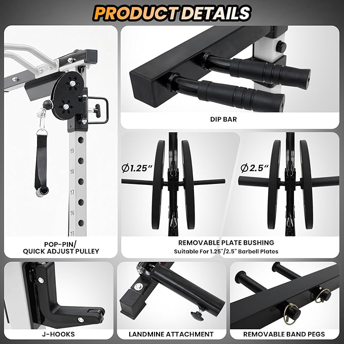 - FULLY EQUIPPED FOR WORKOUTS: No need to buy the extra fitness accessories. All come with home gym squat rack. We provides 23 free attachments, 2 Nylon Safety Straps, 2 J hooks, 2 Dip bars, 4 Resistance Band Pegs, a Lat Pull Down Bar, a Cable Bar, a 360 degree Detachable Landmine, a Ankle Strap, a Tricep Rope, 2 Cable Handles, a Chain, 4 Weight Holder Clips and a Footboard.