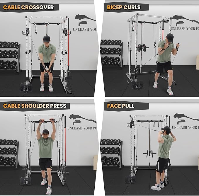 - ENDLESS TRAINING POSSIBILITIES: No home or garage gym should be without a power rack. Our power cage can bring power rack, cable Cross-Over machine, lat pulldown station, low row station (includes footplate attachment), chin station, dip station, core trainer, landmine station to your home gym at the same time. You can train your full-body with just one device. It can be used by multiple family members at the same time, making it perfect for your home gym.