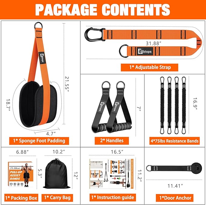 - 【Versatile assisted pull up bands for Fitness 】- It comes with adjustable height straps,4 high quality resistance bands,foot pad sling hanging straps,handle and door anchor which help you achieve various exercise movement as you like.the pouch bag make it easy to carry with after fitness workout,Carrying it conveniently to your home,office,gym or some outdoor occasion