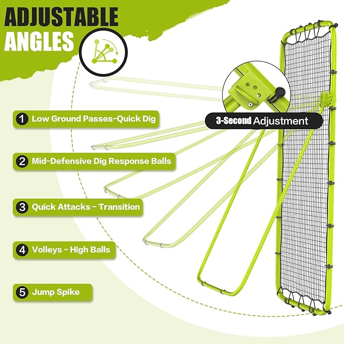 - 5 ADJUSTABLE ANGLES - 3 SECONDS CUSTOMIZATION: This rebounder for volleyball features 5 adjustable angles, only takes 3 seconds to switch between angles which perfectly replicate game scenarios to help you practice the skills in different angles. Whether you’re working on spiking, passing, serving, or digging, this rebound net for volleyball adapts to your training needs and helps you get the most out of every session.