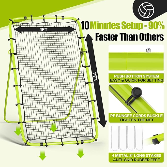 - SETUP IN MINUTES - TRAIN ANYTIME: Time's too precious to waste fumbling with instructions. So our volleyball rebounder net designed with push button system to set up in 10 minutes. Open the bag, snap together the coded poles (tools-free). Reclaim 12+ extra training minutes per session. It is a ideal solution for coaches and players to focus on training without the hassle of complicated setup procedures.