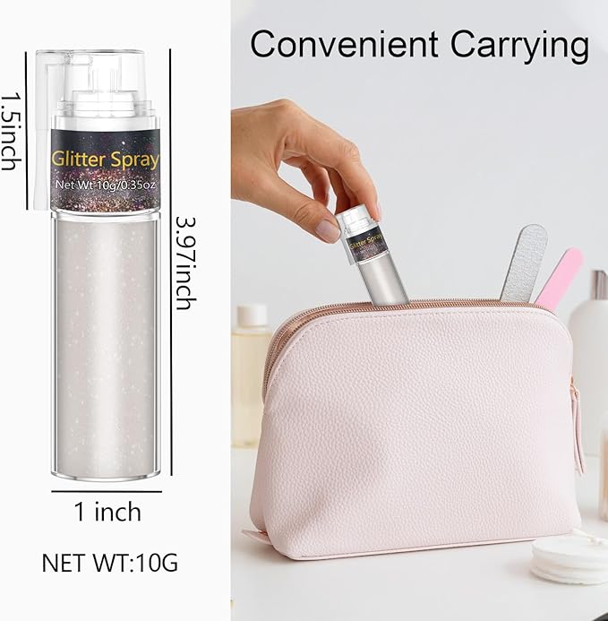 - Lightweight Hair Glitter Spray: Shake well before use, then lightly mist your hair and skin with our body glitter spray for a soft, shimmering glow that stays put. Compact and travel-friendly, this portable bottle lets you dazzle wherever you go—shine anytime, anywhere! Also, our hair glitter can be removed with water or soap.