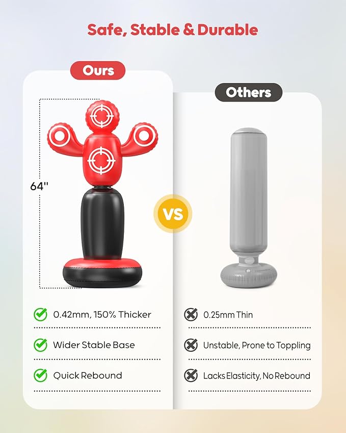 - Safe, Stable & Durable Design: Your child's safety is our priority. Made from heavy-duty, soft PVC, this punching bag for kids absorbs impact to protect little hands. The extra-large base can be filled with water or sand for ultimate stability, ensuring it stays upright as a reliable kicking bag even during a powerful karate chop or taekwondo kick.