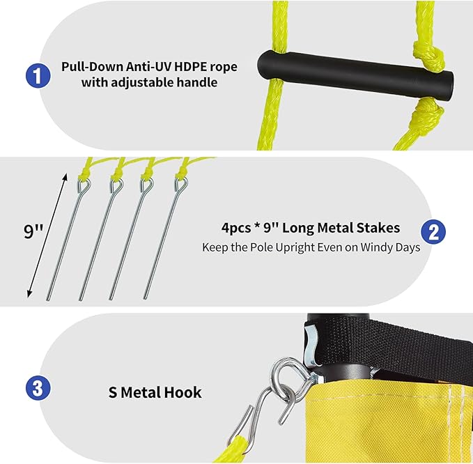 - Premium Adjusting System ! Engineered for stability, this advanced system features a pull-down anti-UV HDPE rope with an adjustable handle, allowing quick tension adjustments for optimal net tautness. Included 4pcs 9’’ metal stakes firmly into the ground, our net ensures upright positioning even in windy condition. The newly designed metal hook and spring clip can fix the adjuster and the net respectively, against sagging.