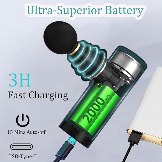 - 【Type C Charging 】Percussion muscle massager gun can be charged by USB (type-c) with 5V/2A adapter (Not Include) or power bank. Fast charging anytime, anywhere for portable use.The massager handheld is equipped with 2000mAh high-quality lithium battery, so it can keep working about lasts for 2-3 hours after per charge. Back massager auto shut-off after 15 minutes of continuous use to protect the motor from overheating.