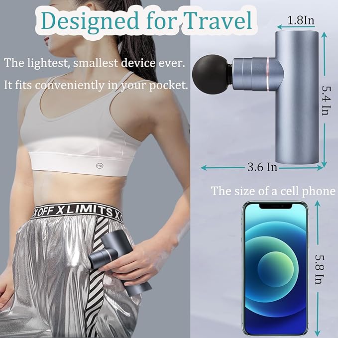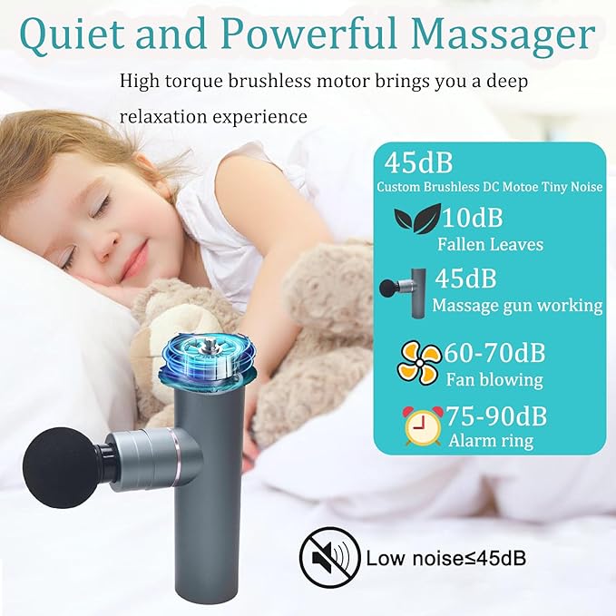 - 【Ultra Quiet and Versatile】Mini Massage Gun with ultra quiet brushless motor for a tranquil massage experience operates at around 45DB, allowing you to stay relaxed and undisturbed at home, on the go or at work.