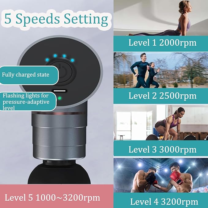 - 【Deep Tissue Percussion Massage Gun】Long-press the power button for three seconds to power on, and press once again to begin the massage, 5 adjustable speeds (2000-3200rpm) of impacts that can be switched at the touch of a button. Choose the speed that suits you best, each speed delivers greater deep tissue therapeutic benefits to the body. Mini massage gun is the perfect massage gun for athletes!