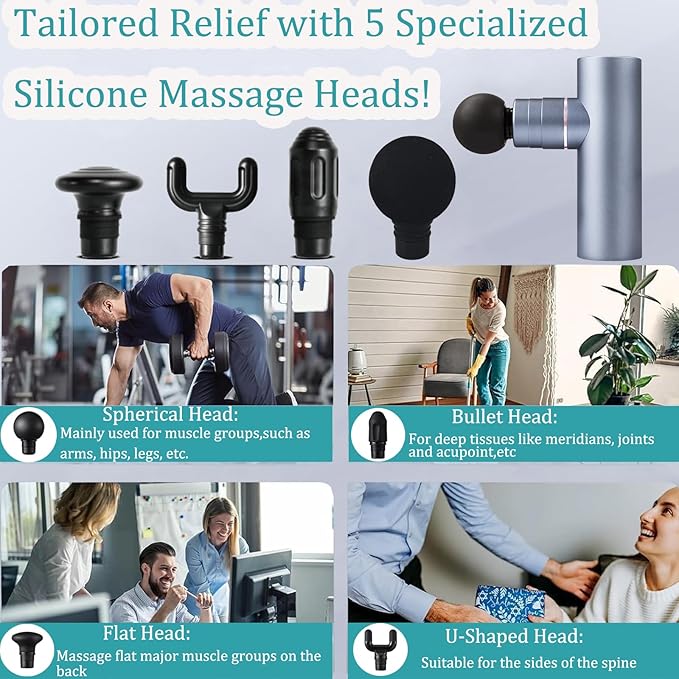 - 【4 Types of Massage Heads】 4 shapes of interchangeable massage heads to target specific muscle groups. Full metal travel size high intensity massage gun can be used extensively on shoulders, neck, hands, legs, soles and other areas. Ergonomic grip design for effortless use. Massage heads are resistant to dirt and durable, can be washed. Don't worry about sweating or getting dirty.
