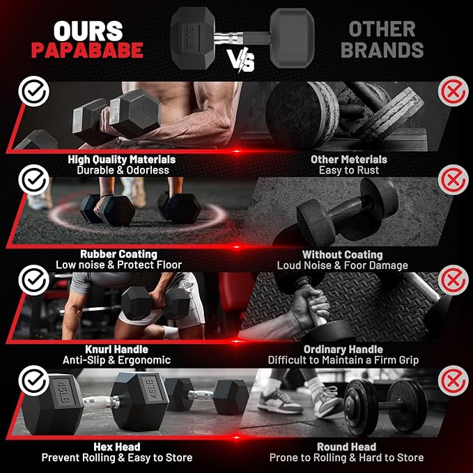- RUBBER COATED TO PROTECT FLOORS: Encased in premium virgin rubber, these rubber hex dumbbells protect floors and equipment from scratches while reducing noise.Durable and reliable, this free weights dumbbells set is ideal for both beginners and advanced users.