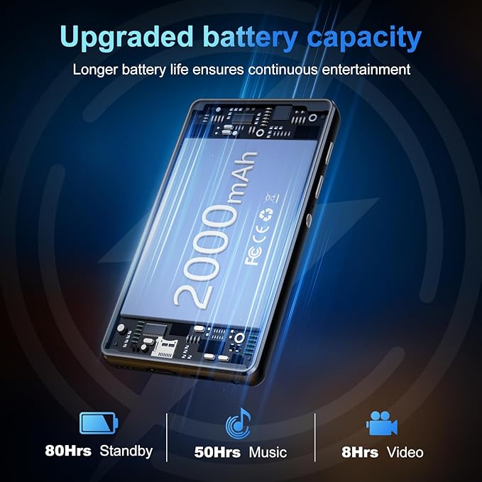 - 【Large Capacity Battery】Our MP3 Wifi player has a built-in 2000mAh lithium battery, support USB charging. It adopts a low-power design and can continuously play music for 45-50 hours or videos for 6-8 hours. It is not only an MP3 player, but also your soul partner when traveling, exercising, driving, and sleeping.