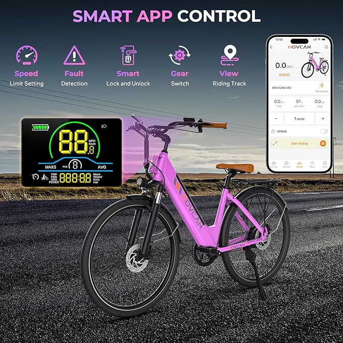 - 【Powerful 1000W Motor】Movcan V80 electric bike Built-in a 1000W(Peak 1500W)brushless hub motor, electric bike for adults can reach a top speed of 28MPH, robust motor delivering 80N.M torque, easily overcome 30° steep hills. You can enjoy a comfortable riding experience and powerful braking even on steep slopes, rugged terrain, or other extreme terrains.