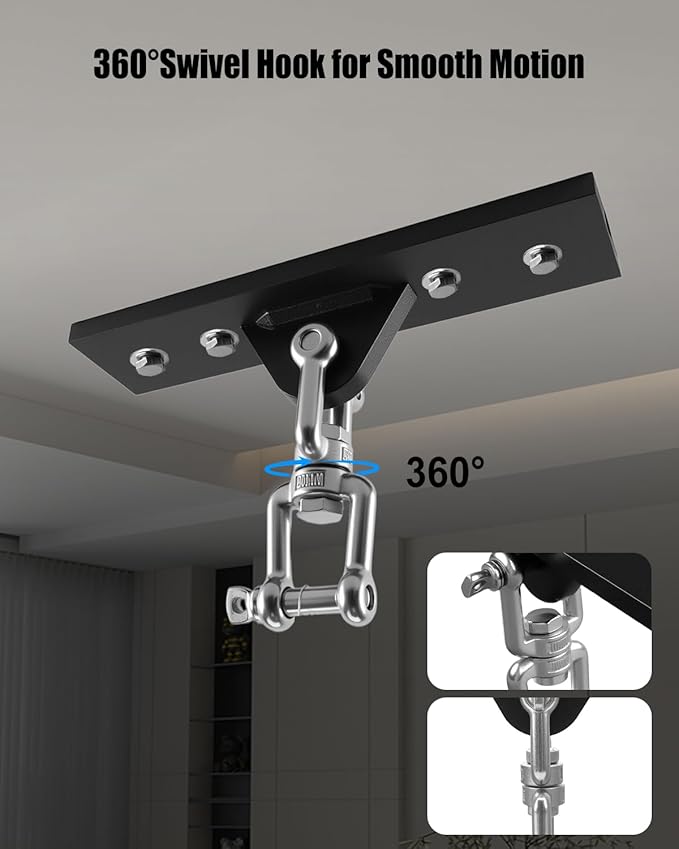 - 360° Swivel Hook: Equipped with a 360-degree swivel, the mount allows your bag, swing, or hammock to rotate freely without twisting the straps. Enjoy fluid movement—without friction or interruption