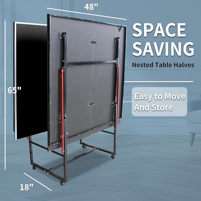 - 【Portable Storage】 Foldable ping pong table separates into 2 independent halves, more portable table tennis table & stores in smaller spaces. Unfold one table half for solo playback mode when without a partner.