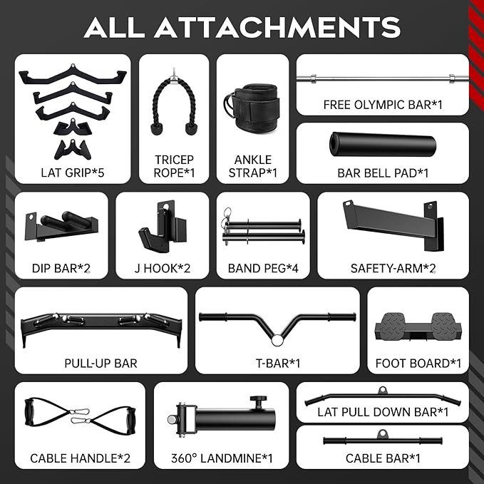 - Maximize your training with our workout cage, which includes over 20 free attachments: 2 J hooks, 2 Safety Spotter Arms, 2 Dip Bars, 2 Cable Grip Handles, a Lat Pulldown Bar, a Row Bar, a Row Low Foot Board, a 360° Landmine, 4 Plate Storage Pins, 4 Weight Holders, 4 Band Pegs, 5 LAT grips, a Tricep Rope, a Free Olympic Bar, and an Ankle Strap. These versatile attachments enhance your strength training, allowing you to perform a wide range of exercises to meet all your workout needs!