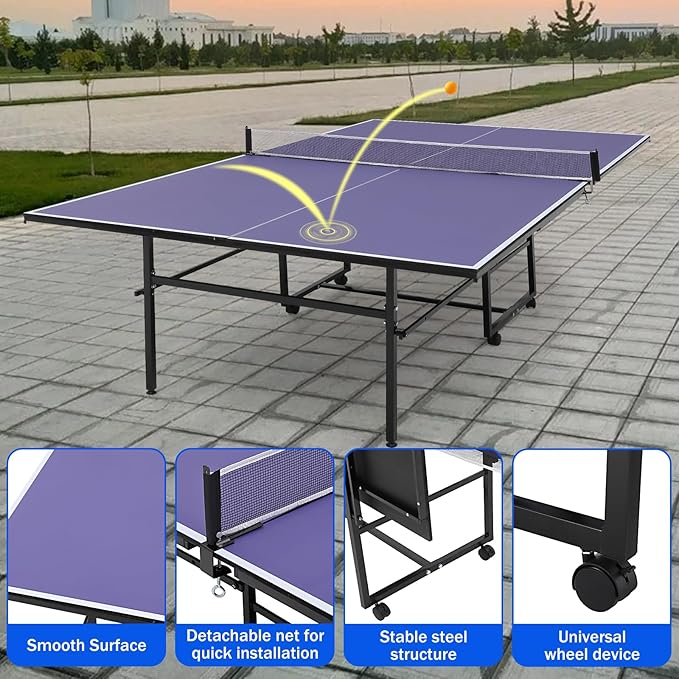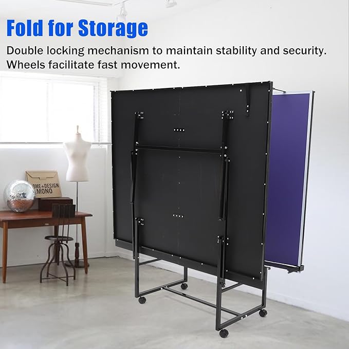 - 🏓【COMPACT STORAGE】Our table tennis table features a foldable design on each half with a double locking mechanism for effortless storage. Equipped with wheels at the bottom (4ft/6ft/8ft/9ft), it can be easily moved and securely locked into the storage place or playing field.