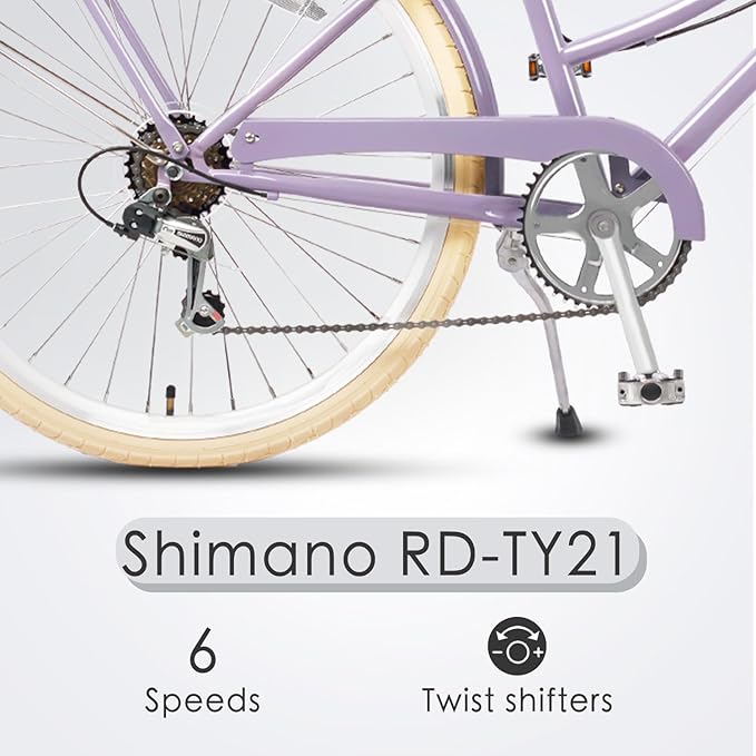 - 🚴♀️【Women-Centric Ergonomic Design】Crafted for female proportions: A low-step high-carbon steel frame enables easy mounting, while the swept-back handlebars promote upright posture (reducing back strain). The brown synthetic leather saddle with shock-absorbing springs combines vintage aesthetics with modern comfort.