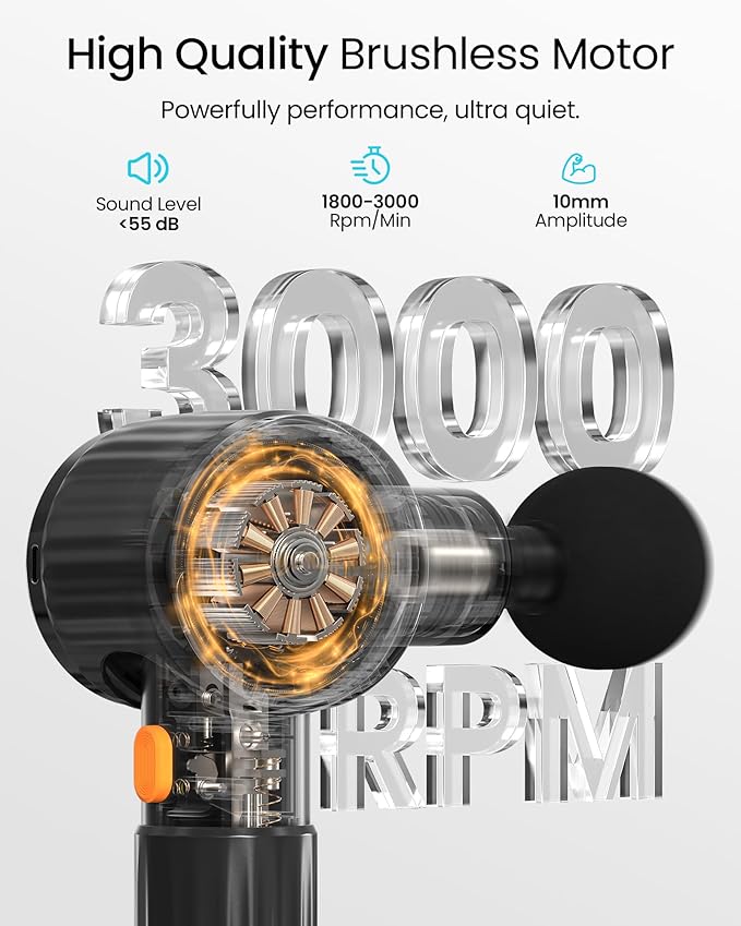 - 【Powerful Performance & Ultra-Quiet Design】The percussion massage gun is equipped with a high-quality brushless motor that delivers powerful percussion (1800–3000 RPM variable speeds, 10mm amplitude), with noise below 55dB (as quiet as a library). Enjoy deep, peaceful therapy at home, the gym, or the office without worrying about disturbing others.