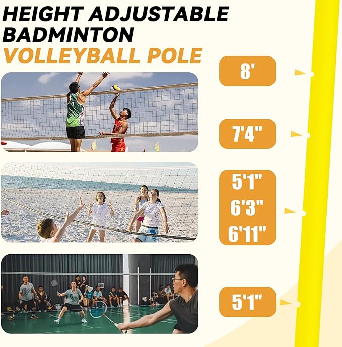- 【Adjustable Volleyball Poles for Backyard】Our volleyball net features adjustable height poles, professional volleyball net set has a height of 8 feet and features six-level height adjustment functionality.Only adjust the height and replace different nets to hold different games.