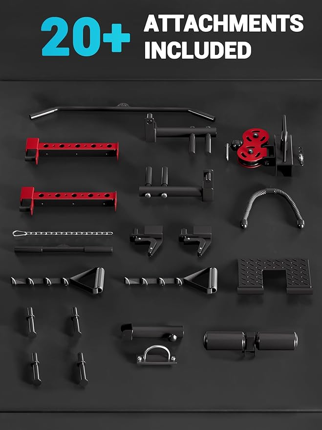 - 【Full Attachments & Storage】 – Includes lat bar, straight bar, tricep rope, row handle, ankle strap, carabiners, and chain. Equipped with plate storage pegs and a leg hold-down attachment to keep your home gym organized.