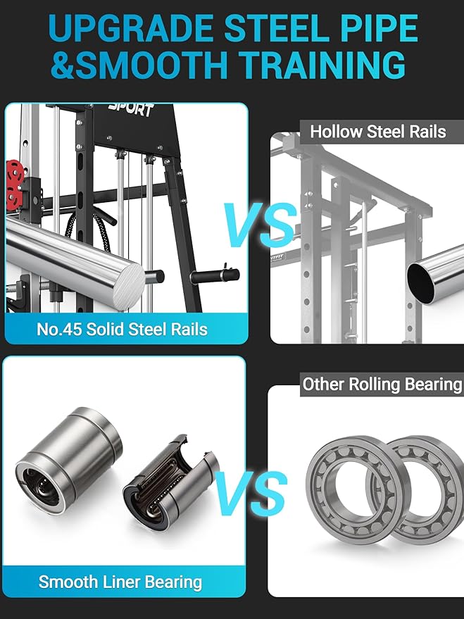 - 【All in One Smith Machine】 – This multifunctional smith machine combines a power cage, squat rack, cable crossover machine, and pull-up station. Perfect for a full-body home gym workout station in one compact design.