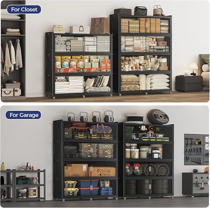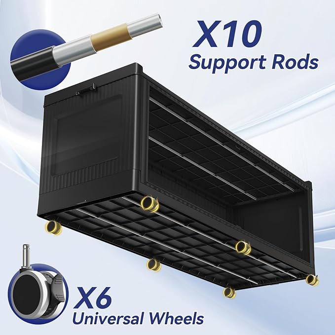 - 【10x Support Rods & 6x Rotating Wheels】Each 4-layer storage cabinet has 5x2 full metal support rods embedded in the bottom and lid. The more heavy-duty foldable storage bins can bear up to 180-220lb, far exceeding other fragile plastic folding storage bins. The wheeled storage bins design with 6x 360-degree rotating wheels, allowing for easy movement.WARNING : CHOKING HAZARD-small parts. Not for children under 36 moths.