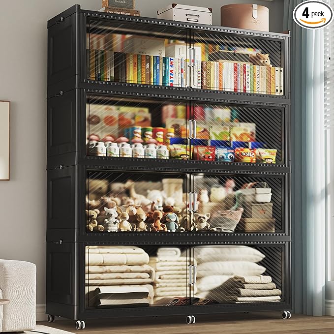 320GAL Extra Large Stackable Storage Bins with Lid, 1280QT Plastic Closet Organizer and Storage Cabinet with Wheels and Doors, Folding Storage Box Container for Home Organization, 4Pack Black