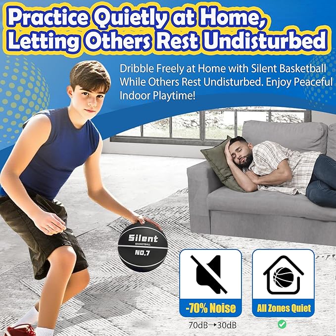 - 3. 2025 Upgraded Silent Technology & Authentic Bounce Experience 85% rebound accuracy with our high-density foam core, engineered for noiseless dribbling (under 30dB). Perfect for apartment dwellers, office breaks, or late-night practice. Unlike traditional foam balls, our stretchy fabric cover mimics real basketball grip without peeling—ideal for adults mastering handles or youth building skills