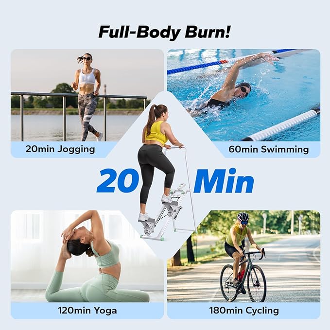 - 【 Total Body Sculpting 】 Whether you're aiming to tone your chest, glutes, or legs, this vertical stair climber delivers results. Just 20 minutes on the climber is equivalent to 20 minutes of jogging, 60 minutes of swimming, 120 minutes of yoga, or 180 minutes of cycling, making it an efficient and effective choice for any fitness level.